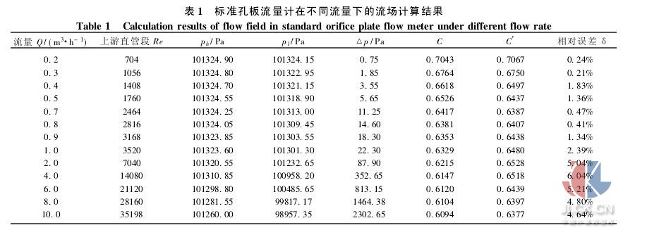 在已知qV的前提下,可以通過CFD數值模擬得出孔板前后D和D/2截面上的壓力差△p,然后將qV、△p代入式(2),求出數值模擬流出系數C′。